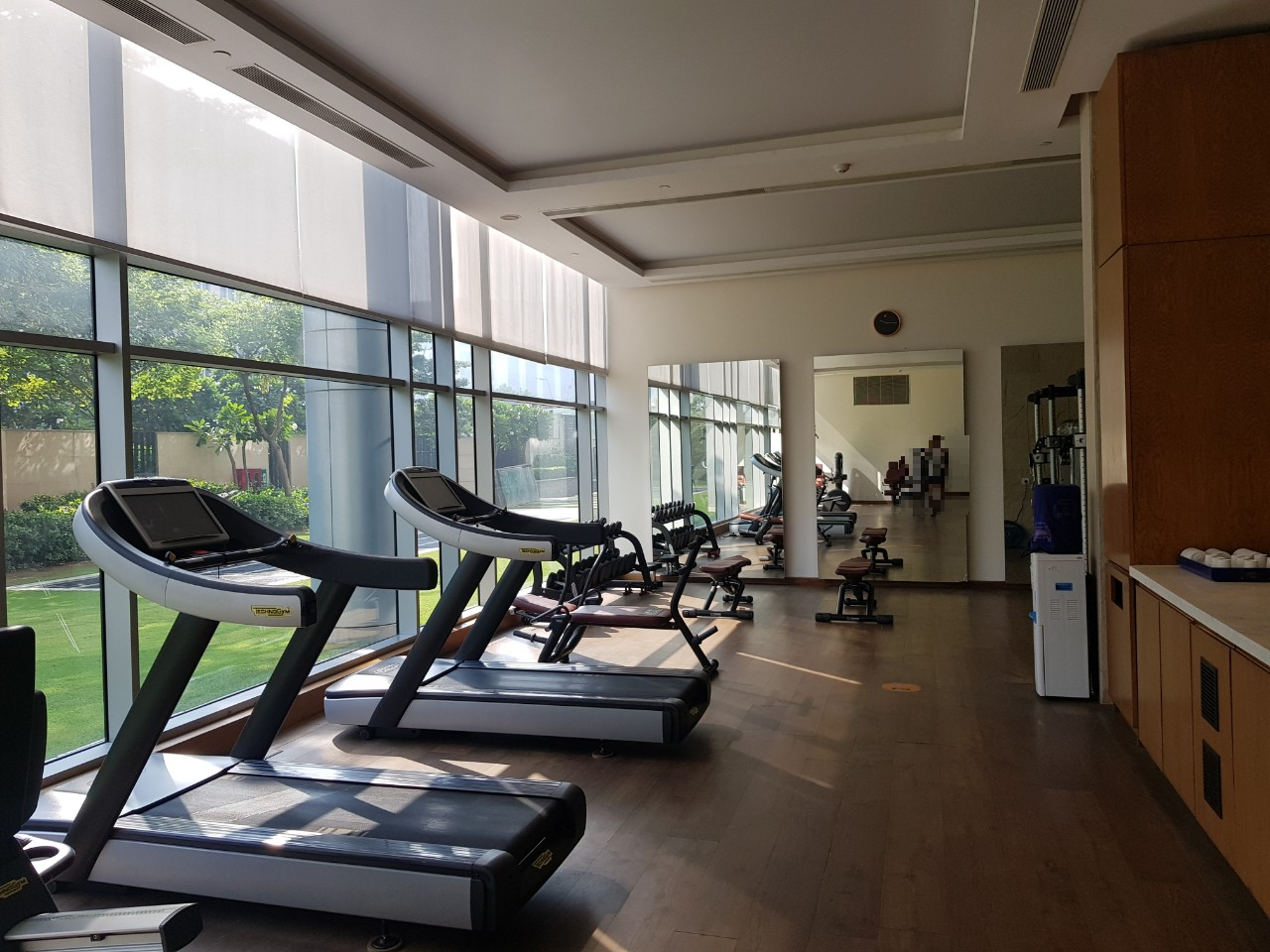 피트니스센터는 호텔 로비 1층에 있습니다. 러닝머신이 3대 정도 있었어요. 따로 파워 렉은 없었고 덤벨과 각도 조절이 가능한 벤치가 있습니다. 등 운동하는 랫 풀다운 머신도 같이 있었어요. 피트니스센터가 채광 좋은 곳에 있으니깐 좋았어요. 바로 옆에 문이 있어서 잔디 걷는 맛도 있었습니다.