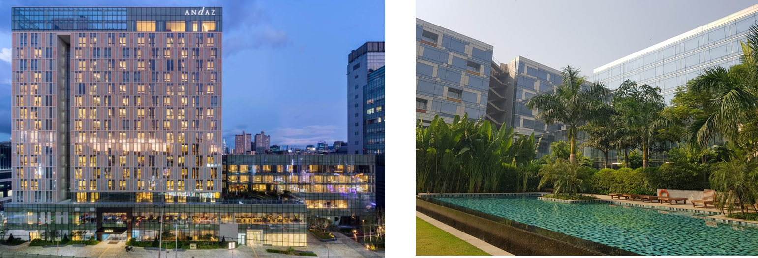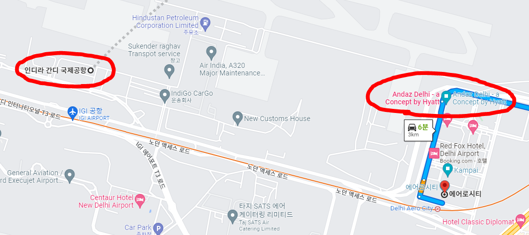 인도 델리의 인디라 간디 국제공항에서 호텔과의 거리는 3km 밖에 되지 않아요. Aerocity라는 지역에 있는데 근처에 메리어트 호텔과 같이 5성급 호텔이 많습니다. 델리나 근처 도시인 그루가온에 업무가 있으시면 Aerocity 근처 호텔에 묵는 것도 좋을 거 같아요.